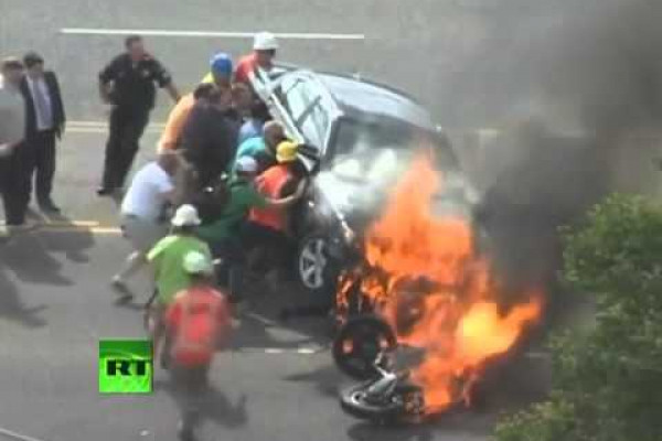 A Utah motorcyclist who was pinned under a burning car expressed his gratitude on Tuesday for the help of strangers who lifted up the 4,000 pounds (1.8 tonnes) vehicle to rescue him, in an act of bravery captured on amateur video.