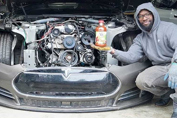 Of course, Teslas have been mocked up with V8 engines and exhaust pipes before. But to truly gut a rescued Tesla, remove the existing electric drivetrain, and install a growling, thumping fantastic GM LS from a 2011 Camaro. For the build, 2 salvaged Tesla Model S were needed, one with flooded electric motors and one with recycled structural components. The video shows him and his hired hands successfully installing the engine and gearbox into the Model S's front. Anyone who can overcome Tesla's harsh and immoral business tactics is Rich.