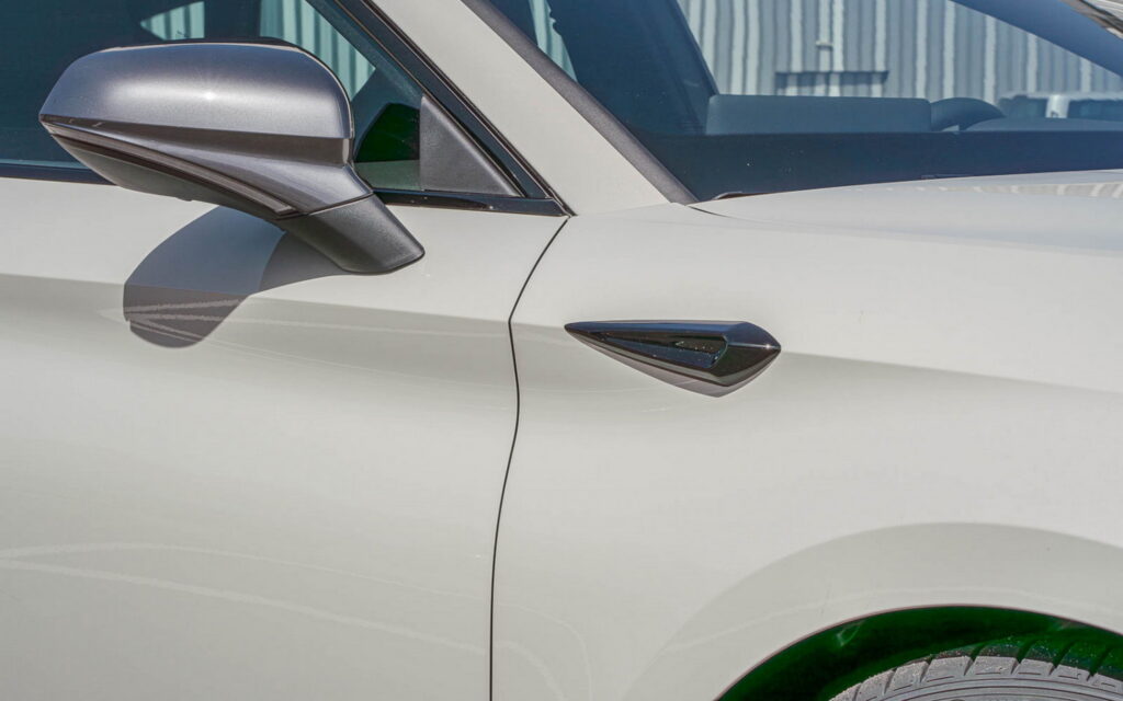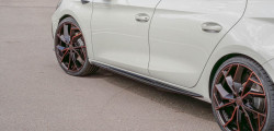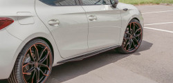 The standard size for these bi-tone wheels is 235/30 R20 tires; however, smaller wheels in 18 and 19 inches are also an option. The Cupra Leon's bodykit consists of a front splitter and side skirts, a rear spoiler, and faux side gills on the front fenders.