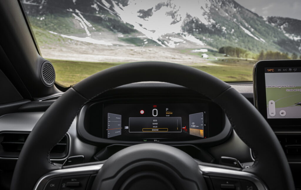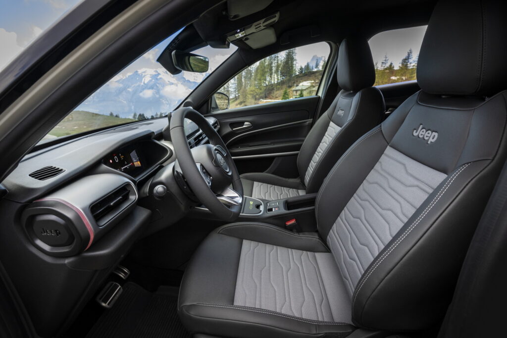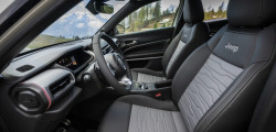 Particularly, in comparison to the front-wheel-drive models, the 4xe Jeep Avenger sits 10 mm (0.4 inches) higher and has a multilink rear suspension. The black alloy wheels come with M+S tires as standard, but you can also have them wrapped in the All-Terrain 3PMSF rubber if you like. In addition to better traction and 8.3 in of ground clearance, the 4xe has a reworked front bumper with more protective cladding and higher-mounted fog lights, standard roof rails to hold more gear, bumpers with anti-scratch finishing, a matte hood sticker as an optional extra, and a rear tow hook for tough terrain.