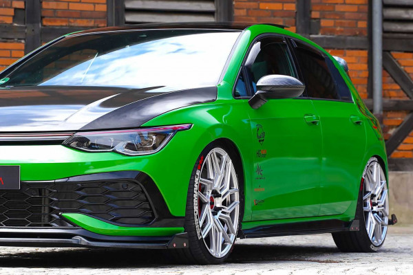 The vivid green foil on the Golf GTI Clubsport was added by JMS Fahrzeugteile, who also gave the car a black roof and a carbon-like finish on the bonnet.