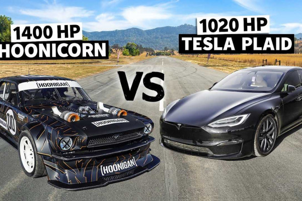 Famed racer Ken Block uploaded a video on his YouTube channel with his 14-year-old daughter driving the iconic 1,400 hp Mustang in a drag race against a 1,020 hp Model S Plaid. This Ford Mustang Hoonicorn is powered by a 6.7-liter V8 engine capable of producing 1,400 hp and is controlled by a sequential gearbox. The supercar weighs 1,360 lbs with all-wheel drive.
