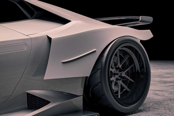 The kit shows a rear-end with a bespoke bumper, sharp aerodynamic flicks, a towering rear wing, and a unique diffuser with subtle fins on both sides. The side-view of the Lamborghini Huracan shows half of the front tires exposed and new skirts and aftermarket wheels.
