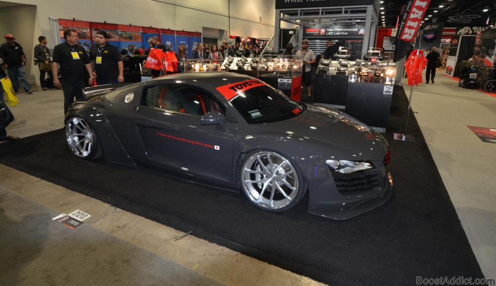 Japanese tuner Liberty Walk has taken an Audi R8 and blown up the fenders! Well, not really but they sure are exaggerated. They have done this one to show at SEMA which will be held Nov 3 - 6 at the Las Vegas convention center.
