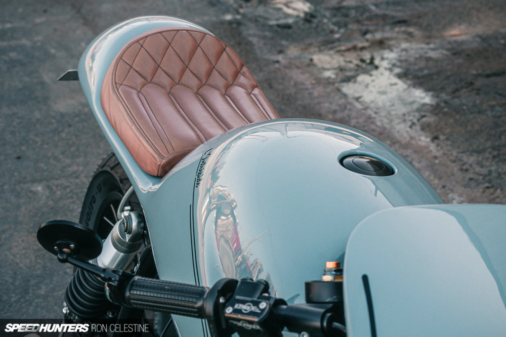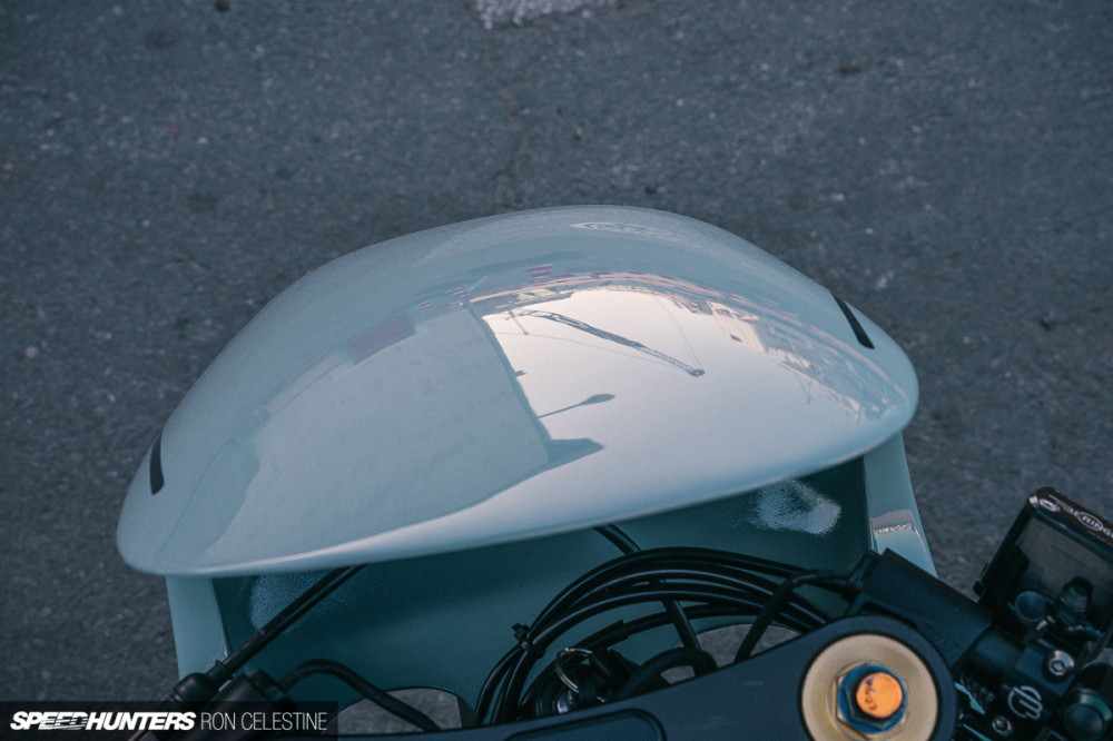 As you might notice from the picture, the designed fuselage visioned as an ideal balance from in front or behind, requires to prevent the clash between windshield, gas tank, and seat, and still have a perfect side profile.