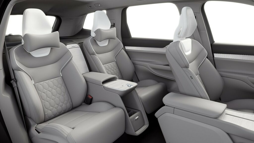 The interior of the Volvo EX90 Excellence showcases two separate rear seats, replacing the conventional second and third rows. You'll notice that a stylish center console thoughtfully divides the seats as you enter the opulent cabin.