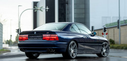 A stainless steel sports exhaust highlights the low-frequency rumble of the new powertrain, further enhancing the audio experience. Manhart strengthened the E31's chassis with stronger brakes, Bilstein B6 shocks, and H&R lowering springs to accommodate the engine change. New 20-inch alloy wheels lined up with the car's boxy fenders and filled the wheel wells.