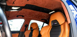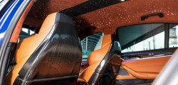 A plush Alcantara headliner, star-shaped LEDs on the roof, and carbon fiber seat shells highlight the interior's brown theme.