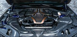 The power upgrades are no joke. Take, for instance, the carbon intake, new turbochargers, a Wagner Tuning intercooler, Carillo pistons, and H-shafted connecting rods.
