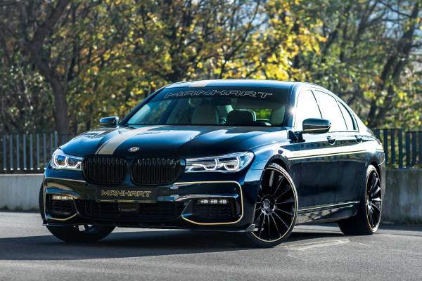 The photographs show a pre-facelift BMW 7-Series with the M Package. However, the performance kit is also compatible with the sportier G11. It has a carbon fiber front splitter and lip spoiler, as well as the extra Manhart livery, which features gold accents around the body and Manhart logos in place of BMW badges.