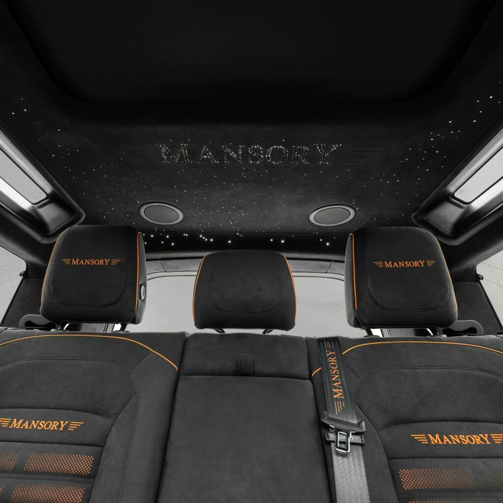 Additionally, you'll see chic orange highlights. The 24x10-inch black wheels with 295/30 tires and lightweight carbon fiber hood, meanwhile, demand notice. The modifications continue at the back with a new split, a two-part wing, a reworked tailgate, and a diffuser. The dashboard, headliner, seats, and door panels are all covered in luxurious Alcantara and have contrasting orange stitching.