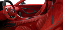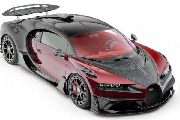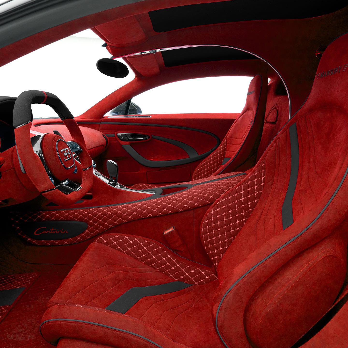 The first portrays the Mansory Centuria in a two-tone treatment, with red painted sections and black highlights, as well as forged carbon fiber elements. On the Bugatti Chiron, the deep red and black color scheme appears to work rather nicely.