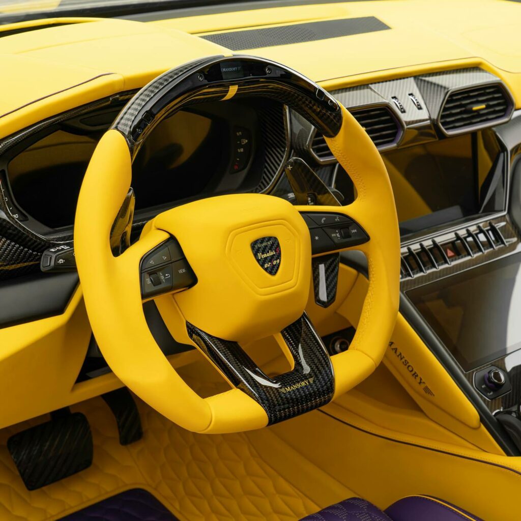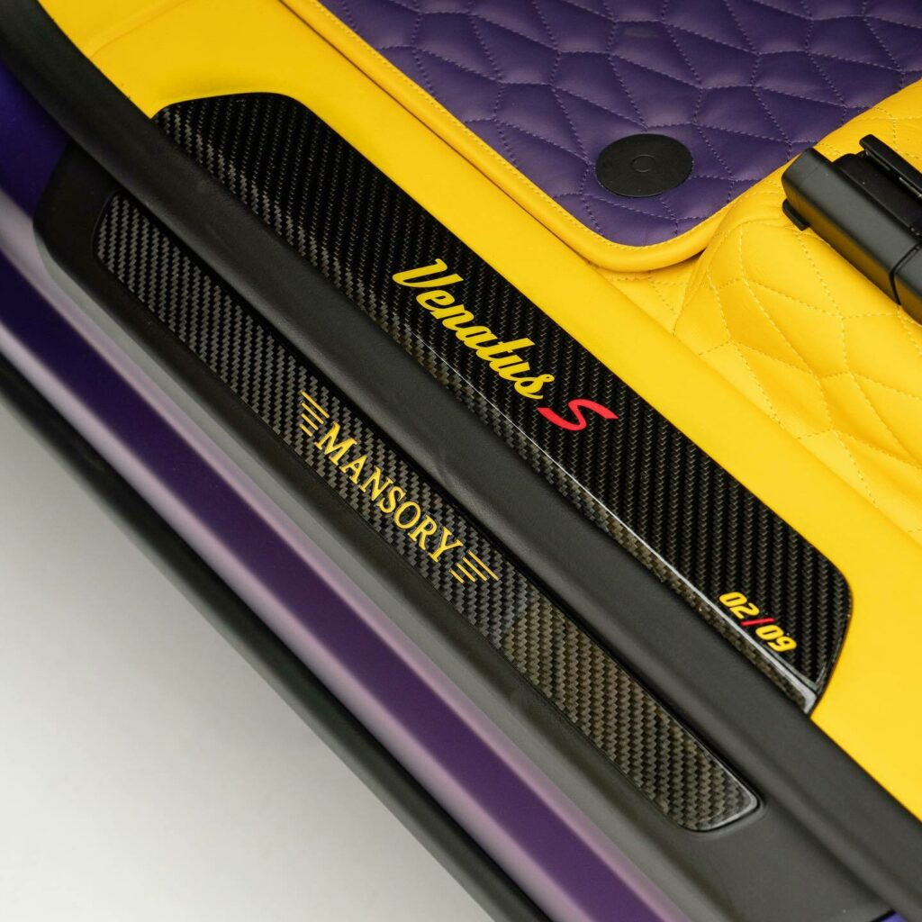 The back seats also have a two-tone design. Along with more carbon fiber elements all throughout, Mansory has also added yellow leather trim to the floor mats, center console, door panels, and steering wheel. Every vehicle has a distinctive badge that identifies which of the nine Mansory-built components it belongs to.