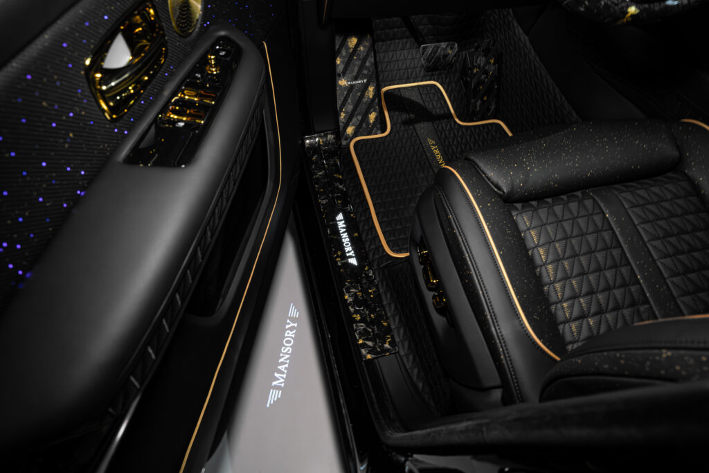 These include the hood, D-pillar trim, rear spoiler, and diffuser. However, regular carbon fiber isn't this. The forged carbon features real gold inlays that Mansory has added. It may be a little much, but the end effect is stunning in pictures and much better in person. The front grille, side window surrounds, door handles, and door trims also feature gold.