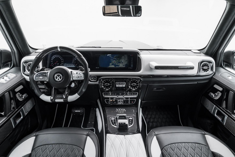 The cabin got some extra carbon fiber trim, adorned the seats, dashboard, steering wheel, and door panels in a combination of black and white leather, and fitted an Alcantara headliner all designed especially for the Viva Edition, and this time we get a little different approach. As for the mechanical modifications and the pricing they are still to be announced. Watch the Mansory Mercedes-Benz G-Class 'Viva Edition' surroundings in the video below.