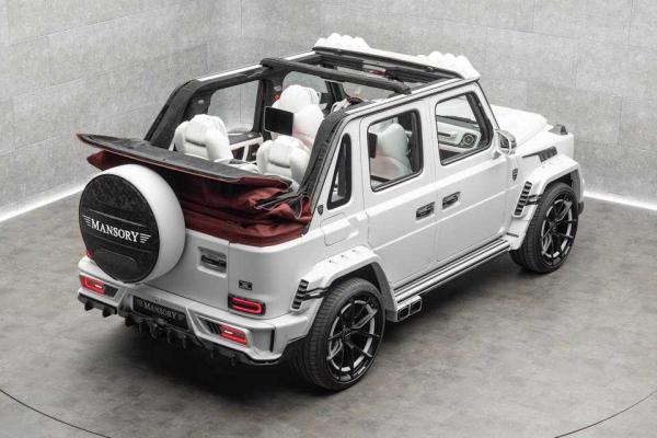 What really sets this Mercedes G-Class apart, though, is the roof (or lack of it.) Mansory has chopped off the top just behind the windshield and added a single central roof support with a retractable red fabric cover. It’s somewhere between a convertible and a safari rig, with a splash of Miami beach cruiser thrown in.