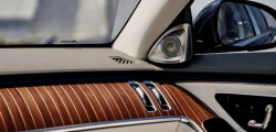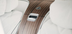 The Maybach has an interior that is also remarkable. Crystal White Maybach Manufaktur Exclusive Nappa leather with ample diamond quilting adorns every surface, including the seats, headliner, door panels, and storage cubby. You'll find wood paneling throughout. The walnut wood inlays, adorned with aluminum trim strips, are designed to mimic the look of a ship's deck.