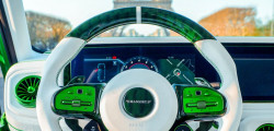 In addition to new blacked-out wheels, the Mercedes off-roader has unusual side steps and side-exiting tailpipes. In the back, you'll find a forged carbon fiber spare wheel carrier, a unique bumper, and a fixed rear wing. Luxurious white leather now covers the seats, center console, doors, dashboard, and steering wheel, among other interior components.