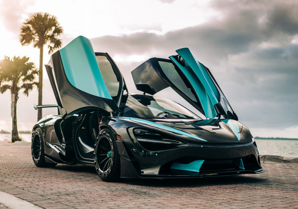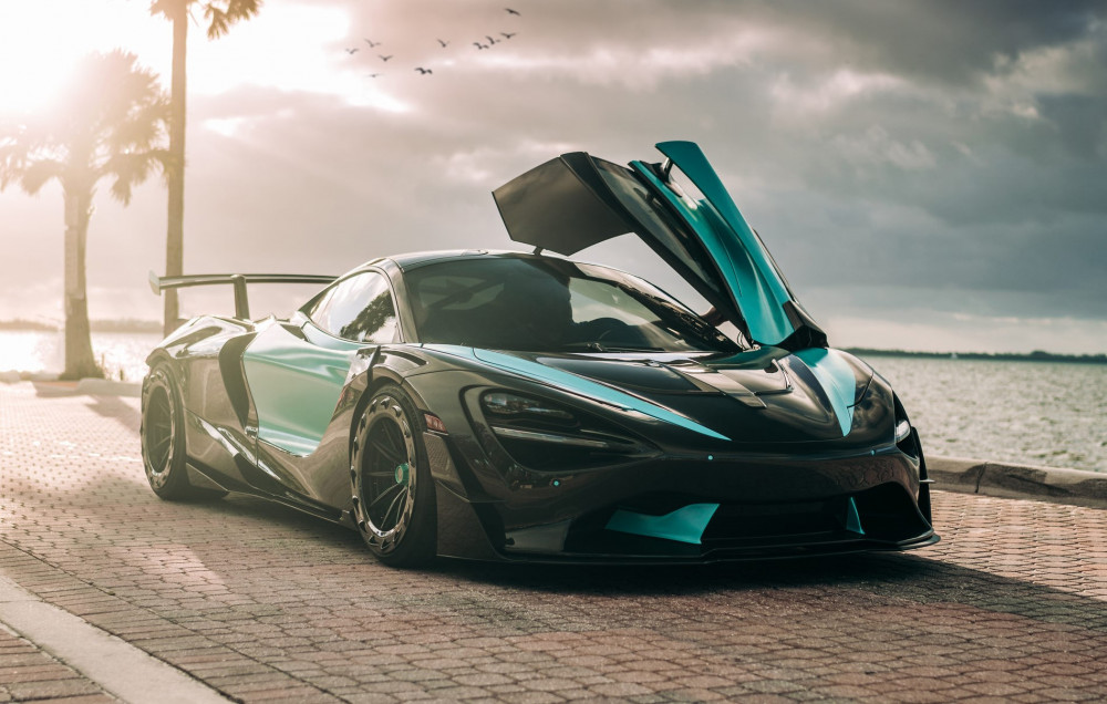 The door's skins are the original ones from the standard 720S. Meantime, both front and rear fenders were flared and add to the road presence of the car, and the airintakes were featured directly behind the doors. The aftermarket specialist added also whhels with turquoise center caps and inner rims, black spokes, and carbon fiber edges with special cutouts in the shape of the McLaren badge. The rear end features new diffuser and a towering wing.