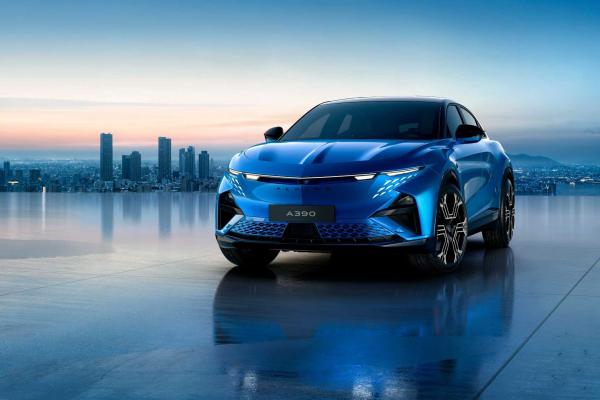 The roofline dives sharply toward the rear, giving the A390 a fast, athletic profile. Angular LED bars stretch across the front and rear, while small triangle details add personality to the front end. Even the lower cladding has a sporty edge, looking more track-ready than typical SUV filler.