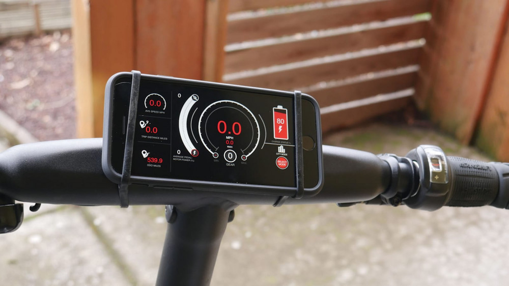 The GoCycle is powered by its 500-watt electric motor mounted in the front wheel hub and can reach a mandated speed limit of 20 mph (32 kmh). It feeds in electricity while you pedal and includes a throttle override. You can even choose between different amounts of motor assist - City, Eco, City Plus, and Custom modes via the GoCycle app connected to the bike via Bluetooth. The app is a clever dashboard showing speed, charge status, and gear on your phone.
