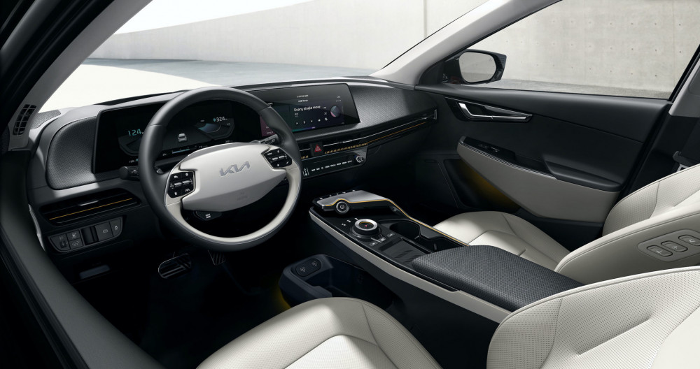 For the interior, Kia used a very distinct one for other Kia models, including a curved screen encompassing both the all-digital gauge cluster and the navigation screen. The two-spoke steering wheel is a simple one, while the control over the HVAC system features touchscreen buttons providing haptic feedback. The EV6 has eco-friendly seats made using recycled plastics.