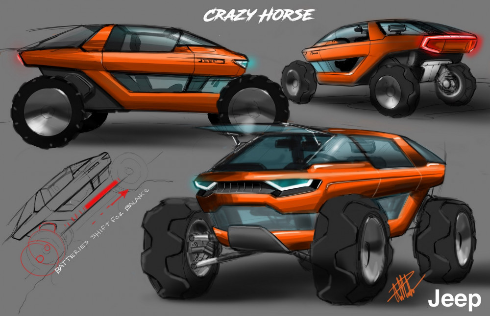 Second place went to the young 10th grade Michigander Rocco Morales for his stunning Jeep Crazy Horse. His concept is a futuristic coupe featuring a minimalist body, lower glass, massive tires, an opening windscreen, and an adjustable wheelbase.