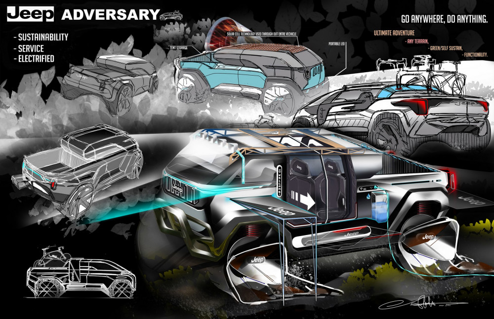 In the 12th grade, Alex Wang won third place for his Adversary concept -inspired by the Jeep Forward Control. Featuring a solar roof, bed with pull-out drawers, Wang’s futuristic Jeep has a retractable table and removable LED lighting units that have the sole role to double as flashlights or lanterns.