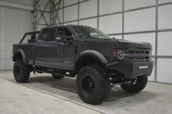 Modified Dana 60 axles and 20-inch Method Race Wheels with 40-inch Atturo Trail Blade mud-terrain tires round out the vehicle. The seven-seater includes two-tone perforated leather seats with heating and ventilation, according to MegaRexx. Second-row captain seats and a motorized folding third-row sourced from an Expedition complete the set. A panoramic sunroof, heated steering wheel, and LineX coating in the bed are all included in the model.