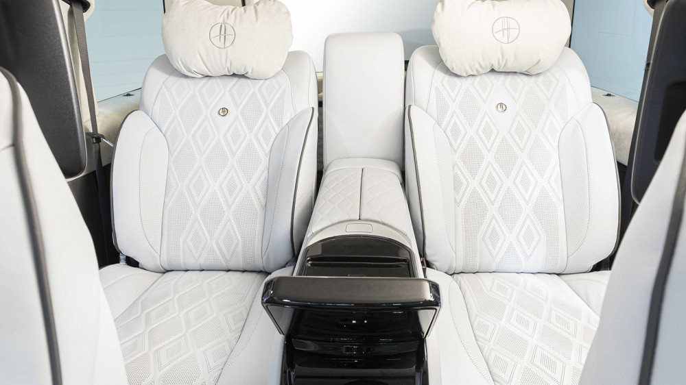 The designer modified on the exterior the fitment of 23-inch turbine-style wheels, distinctive front bumper, chrome grille with vertical uprights, and fancy black and silver two-tone paint scheme. The interior catches attention with upgraded white leather.