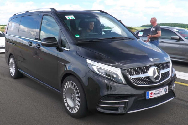 From the outside, there are just a few unmistakable clues that this isn't your average V-Class. It, for instance, rides on new wheels, sits lower than before, and wears badges indicating its AMG motor. The inside of the automobile has remained unchanged. GAD Motors took the van to Germany's Zweibrücken Airport for a rolling drag race, where it competed against a BMW M5, a C6 Chevrolet Corvette. McLaren 720S, and a Mercedes-AMG GT.