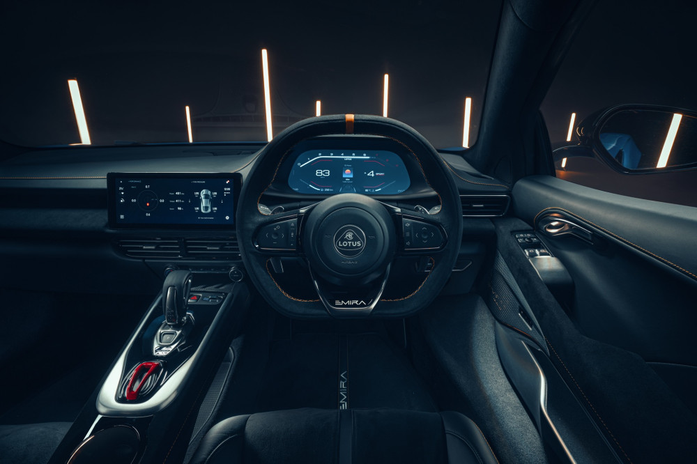 The inside of Emira, meanwhile, is possibly the most stunning feature. Not because it's particularly revolutionary, but because even without going inside, you can see that quality has improved significantly. Instead of Evora's aftermarket double DIN head unit, a modern 10.25-inch touchscreen media system with Android Auto and Apple CarPlay has been installed. A second, much larger digital display is positioned underneath the flat-bottomed steering wheel to support it.