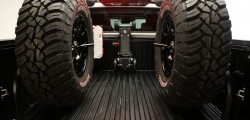 Because it was designed as a support vehicle, the bed includes all an off-road racer could need. This includes off-road tools, such as a specially designed custom mounted jack, as well as a 15 lbs CO2 canister, gasoline, and water storage containers. Additionally, there are two replacement tires and an ARB Tred Pro Recovery Board to help in the recovery effort.
