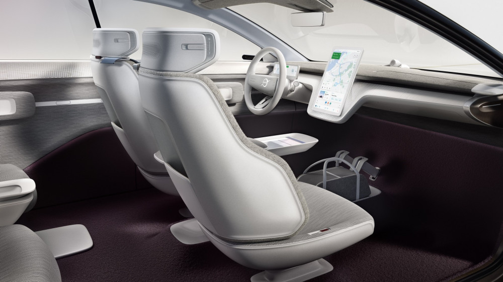 The four individual seats are separated by floating central consoles, while the entire cabin features ecological materials and a storage compartment reminiscing a bag.