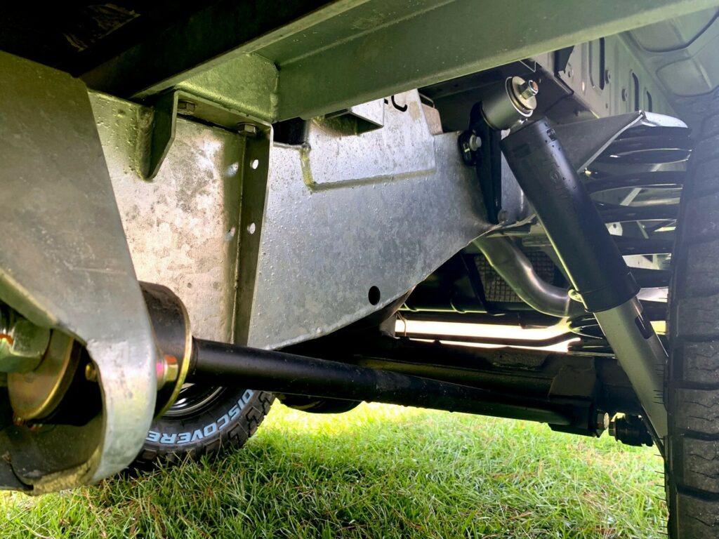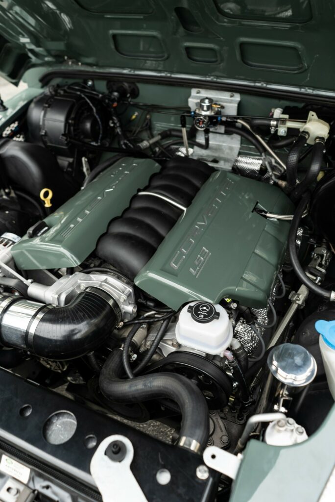 The combination of a classic Defender and a Corvette engine adds an exciting touch to the vehicle. Paired with the V8 is a 6180e automatic transmission and a robust transfer case, enabling power distribution to all four wheels. The builder also includes a new performance exhaust. And how not to mention the striking body panels coated in a unique Keswick Green shade?