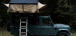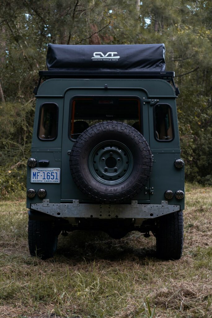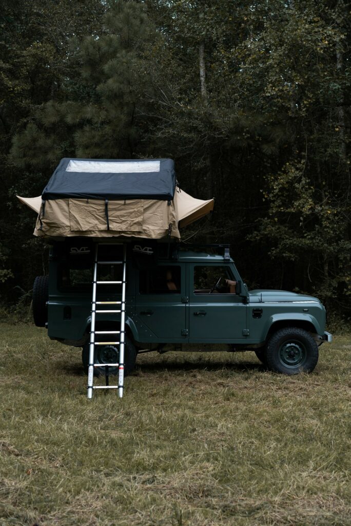 Additional enhancements include upgraded aluminum front wheels, front and rear LED lights, stainless steel oil cooler lines, improved electric fans, heavy-duty axles, stainless brake lines, stainless fuel lines, and more. The inclusion of a sizable rooftop tent and a portable ladder further strengthens the overlanding credentials.