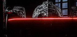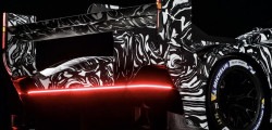 The photos show details of a prototype automobile dressed in camouflage, with an emphasis on the rear end and big back wing. The automobile has a characteristic low rear brake light bar, as shown in the photos. There are no photographs of the car's front end.
