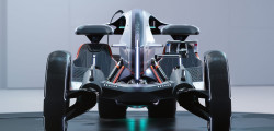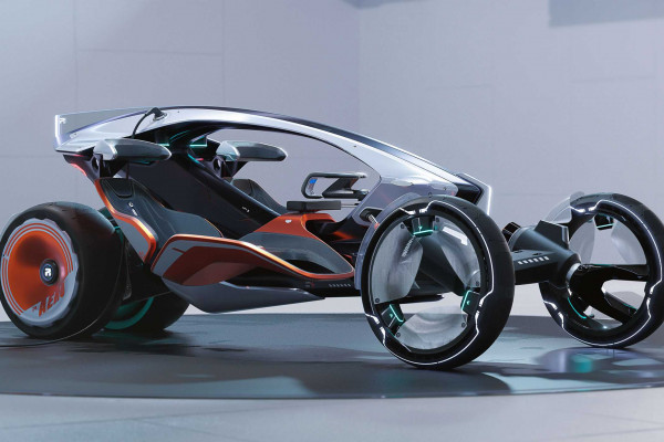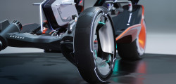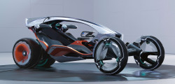 It looks like a cross between an open-wheel racer and a sports bike. The delicate steering elements and front wheels are inspired by Formula One, while the arched rear end resembles an upscaled rendition of a superbike tail, although with an extra stabilizing fin.