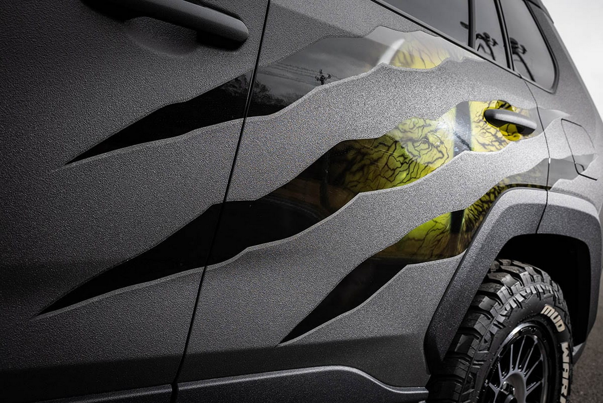 The RAV4 also received unique artwork on the sides that resembled scars from an actual Raptor dinosaur, as well as Raptor decals on the hood and back skid plate. Aside from the attractive paint, the RAV4 received a new set of KMC wheels with Monsta Mud Warrior tires, as well as a 2-inch suspension lift.