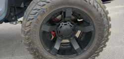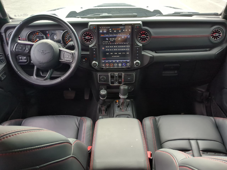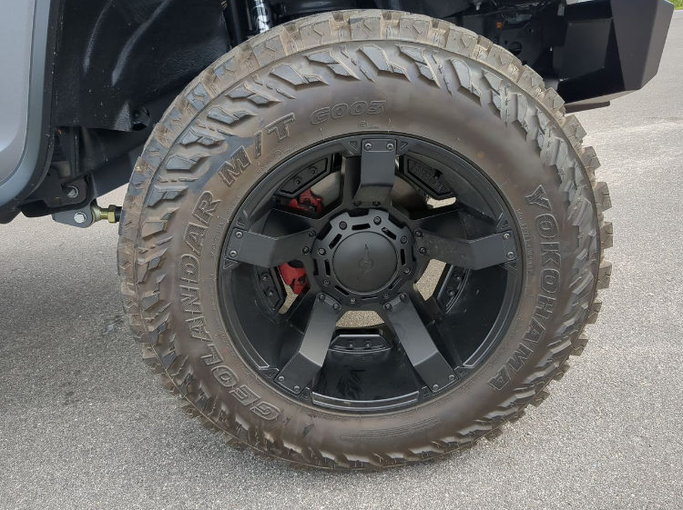 It's an unconventional look that sets this vehicle apart. One of the standout features of this vehicle are the unique taillights that catch the eye. Additionally, the black bumper and sports bar over the bed add to the rugged aesthetic. The aftermarket wheels, finished in black and paired with 37-inch off-road tires, complete the look and make this vehicle ready for any adventure.
