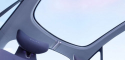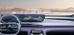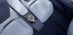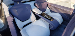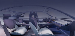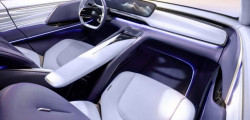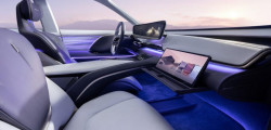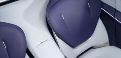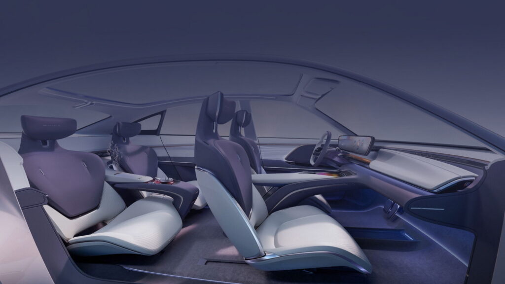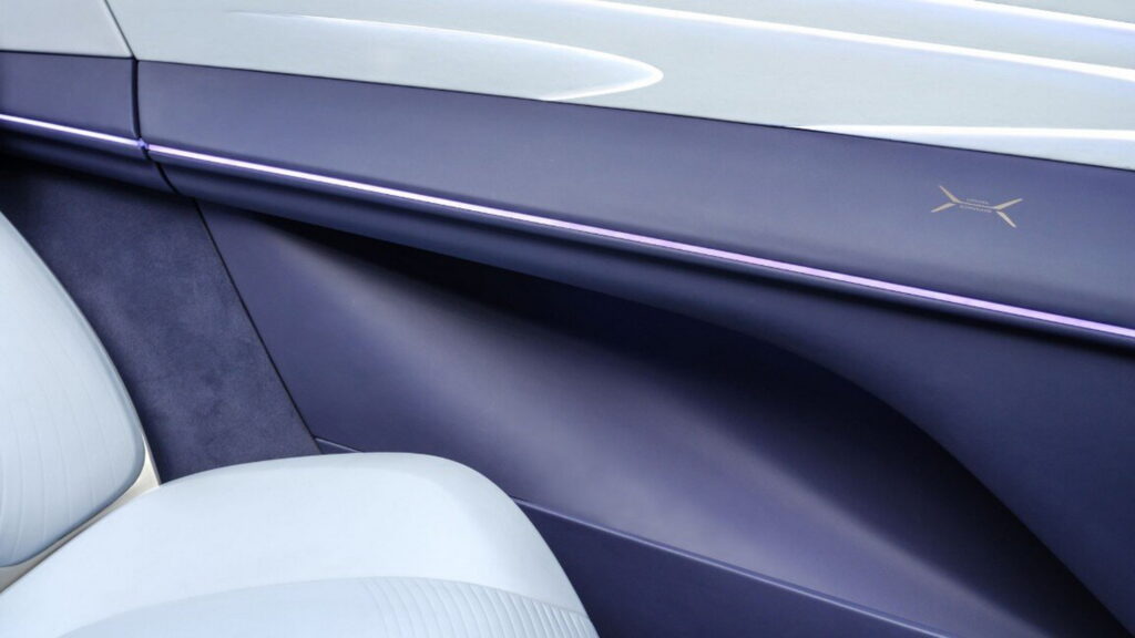 Decorated with eco-friendly suede-like fabric in purple and white, the interior has four separate zero-gravity seats with Surflex cushions. The dashboard is adorned with a panoramic head-up display and a digital cockpit that is floating and slightly curved.