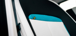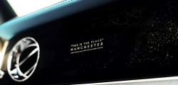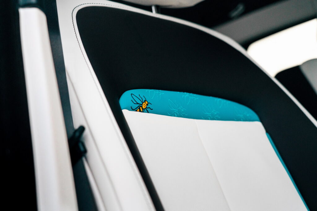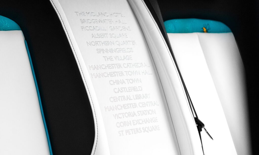 The Manchester Bee, a long-standing symbol of the city's industriousness and productivity, has been integrated into various parts of the car. The Manchester Ghost is a stunning vehicle that showcases the bee emblem both inside and out. The bee is prominently displayed on the C-pillar in a beautiful turquoise color, which contrasts perfectly with the standard silver paintwork.