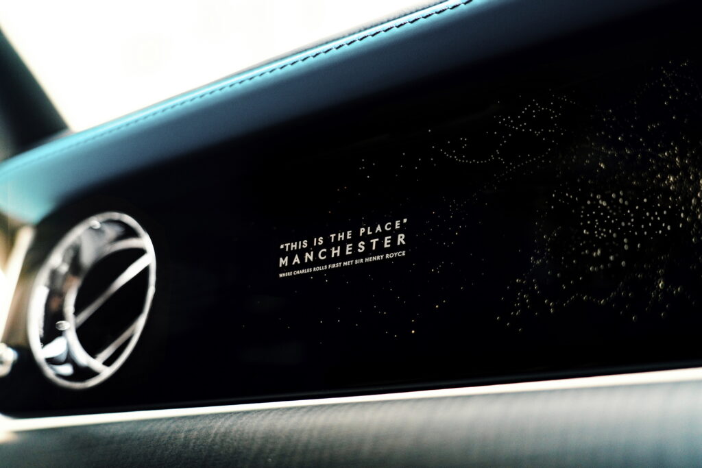 As you step inside the vehicle and make your way towards the back seats, you'll notice something interesting. The names of some of the most iconic landmarks in the city are etched into the surface. It's a subtle yet charming touch that adds to the overall experience of the ride. Also inside, Rolls-Royce used dots and lights. The Midland Hotel, the location of Charles Rolls and Henry Royce's first encounter, is represented by the biggest dot.