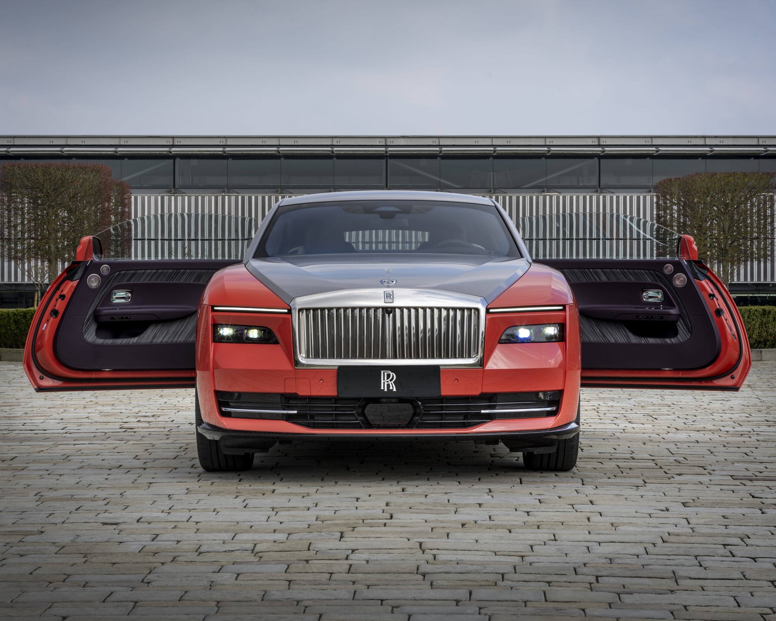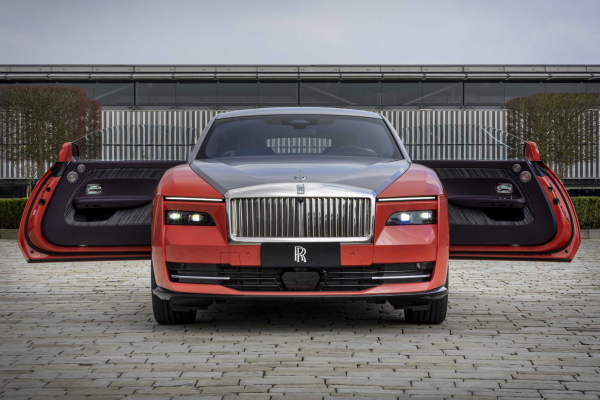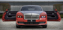 Taking cues from South America and the vibrant colors of the Lantana flower, which is believed to bring good fortune, the next model is based on the new Rolls-Royce Spectre. The Tempest Grey pinstripe and roof complement the car's Lantana Red bottom parts. A softly lit Spirit of Ecstasy completes the artwork, and the wheel centers are likewise painted in the eye-catching crimson hue.