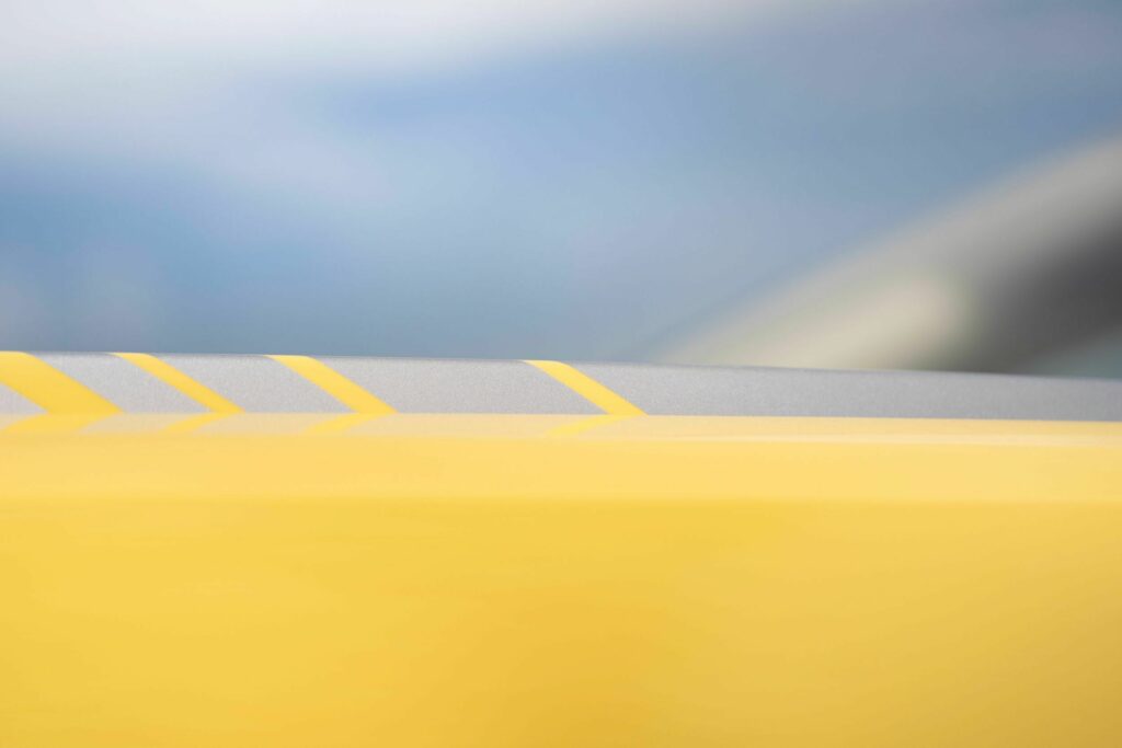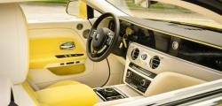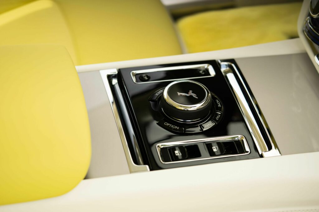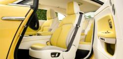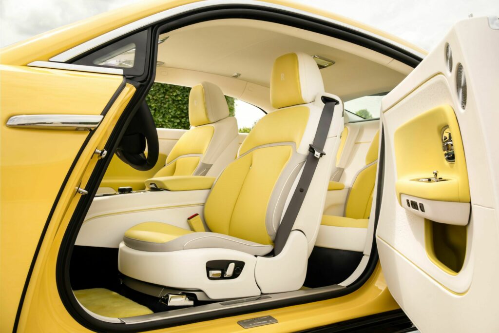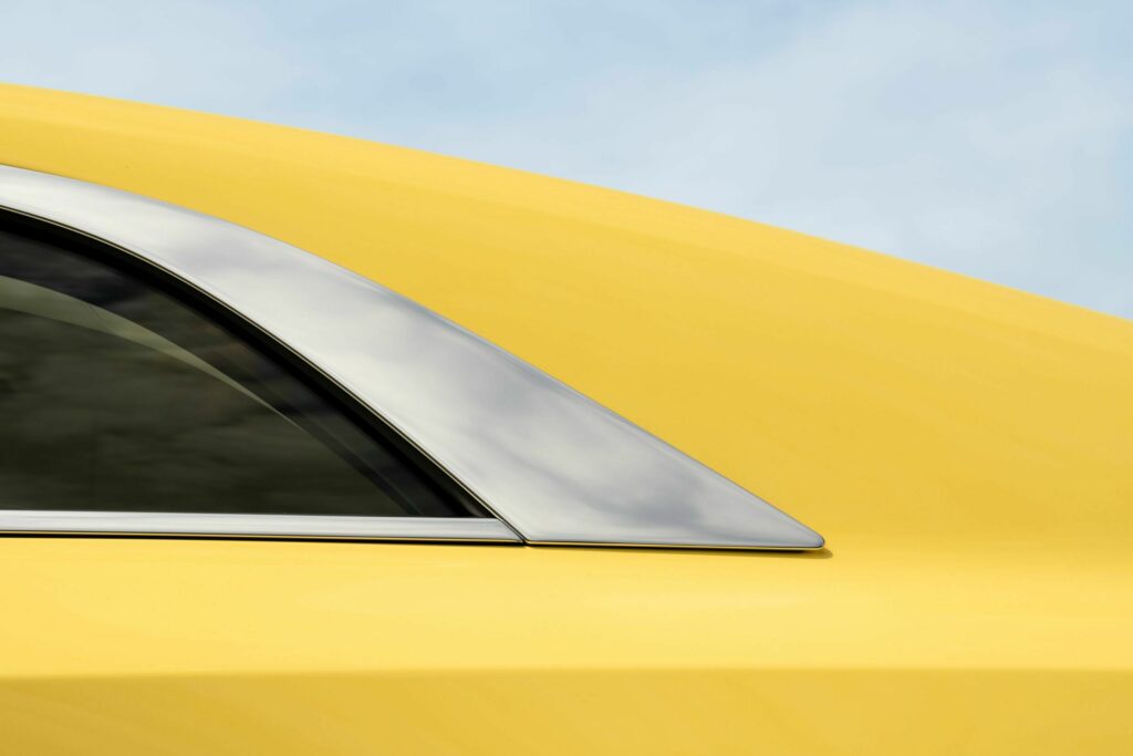 The interior carries over the exterior's bright-colored motif with a deft blend of Citrine and Bespoke Lemon Yellow for the upholstery and matching dials on the instrument cluster. The more subdued accents of Grace White and Slate Grey harmonize with the many forms of yellow, while the dashboard wood inserts are painted in cashmere grey with silver mica flakes.