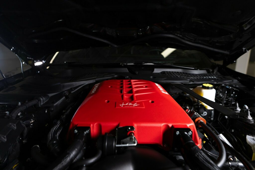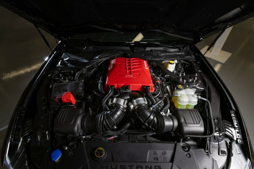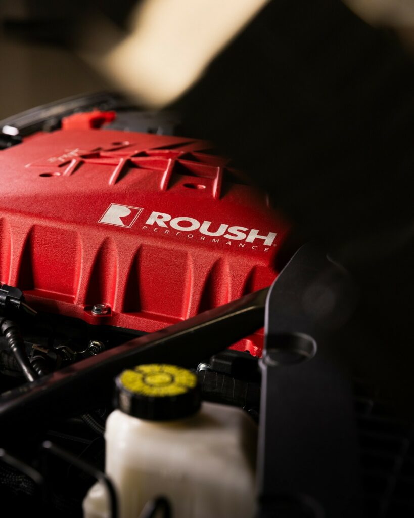A big heat exchanger, billet fuel rails, twin cone fuel injectors with optimized director plates, and a Bosch PCE intercooler pump are all part of the package. A Roush Performance calibration, Ford Performance spark plugs, a Degas bottle, and bespoke hardware are among the other notable features.