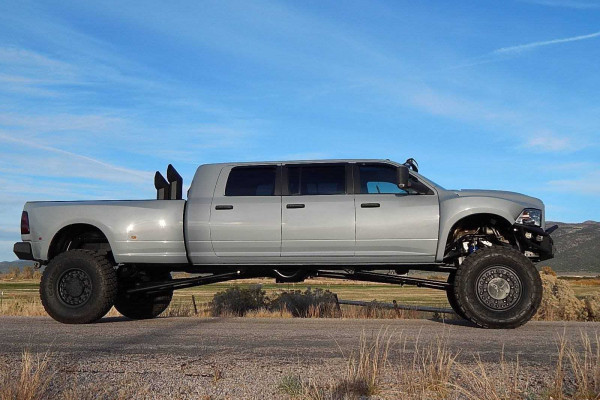 The frame was extended with 5 ft and military AxleTech axels have been provided. Runner RAM Mega runs on 43 inch 365/80R20 Goodyear tires and features such impressive details as 100lb injectors, CP3 pump, ARP, 64 mm turbo, H&S tuner, and a Diamond Eye exhaust.