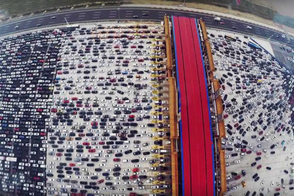 Incredible images were caught by a drone on a 50 lane highway in China.
