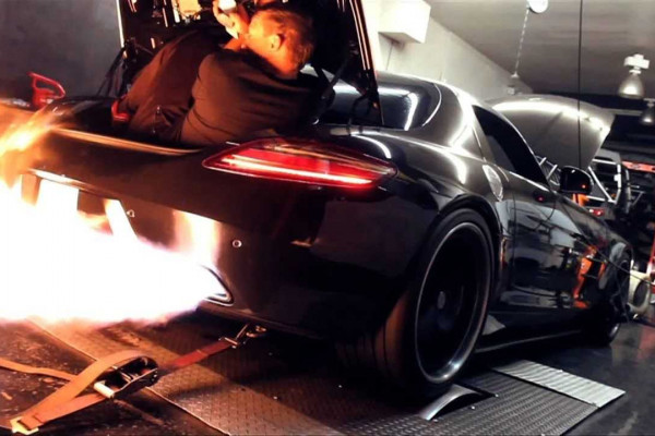 SLS AMG spewing flames and a guy is in the trunk. Nothing is faked.