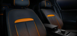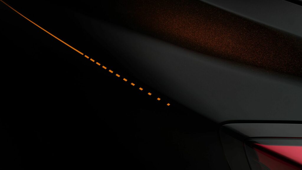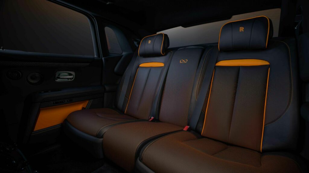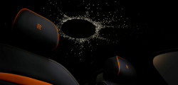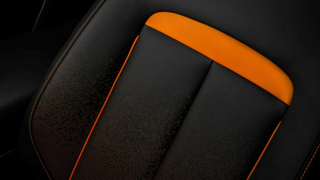 Mandarin accents are gracing the bumper intakes, hand-painted coachline, center caps, and brake calipers Stepping into the cabin, you're met with a beautiful high-contrast color scheme, a blend of Mandarin and black adorning the perforated leather upholstery of the seats. The dashboard tells the story of a total solar eclipse, portrayed in a labor-intensive display that took over 100 hours of meticulous work.